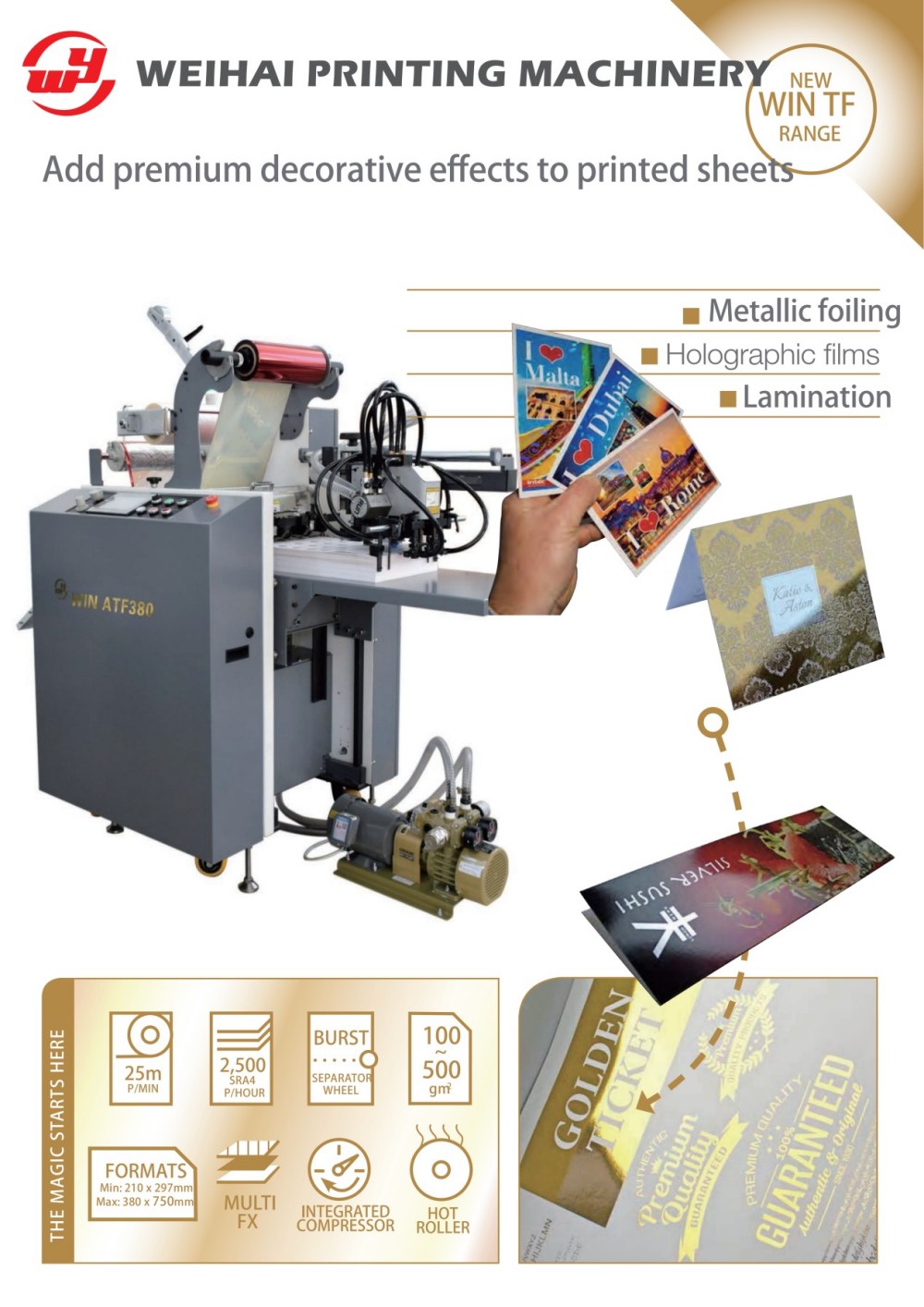 380-milimetrska stiskalnica za laminiranje in foliranje s podajanjem listov, ki jo proizvaja Weihai Printing Machinery Co., Ltd., ima funkcije popolnoma avtomatskega laminiranja in vročega žigosanja. Uporablja se predvsem za digitalne tiskovine, lahko pa tudi samodejno laminira in žigosa ofsetne tiskovine. Je odličen avtomatski stroj za laminiranje in foliranje brez plošč.