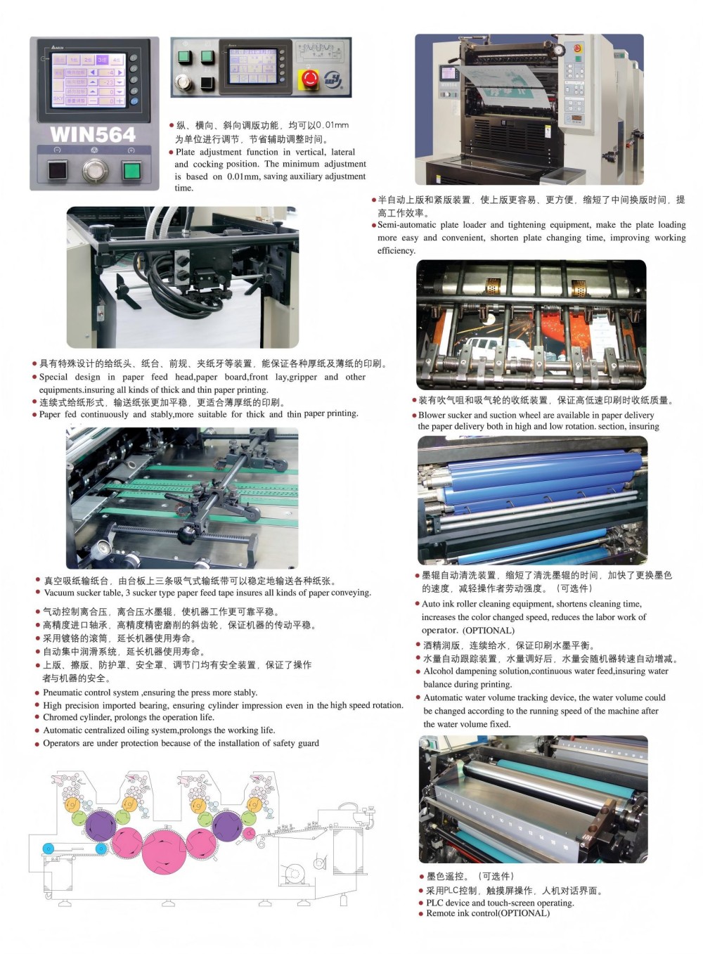 Stroj za ofsetni tisk štiribarvnih nalepk A2 je zasnovan z visoko zmogljivimi moduli in vsi so vrhunske kakovosti – visoko natančni valji in zobniki, močan mehanizem za podajanje papirja, visoko natančen sistem registracije papirja in stabilen sistem za oskrbo s črnilom. Prilagojen je tako, da izpolnjuje zahteve trga po barvnem tiskanju posameznih listov, ki je visoko kakovostno, učinkovito in cenovno dostopno. Prav tako se vam ni treba držati samo ene debeline papirja – deluje s tankim papirjem (0,04 mm) vse do debelega kartona (0,4 mm). Na voljo je tudi nadzor na zaslonu na dotik z intuitivnim vmesnikom za programiranje, ki vam omogoča prilagajanje nastavitev in parametrov tiskanja na pameten in preprost način.